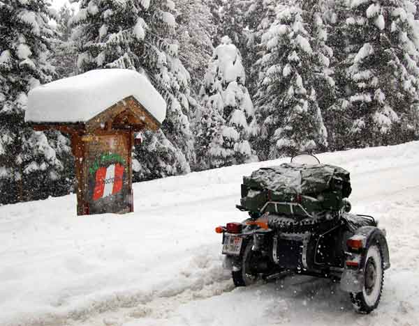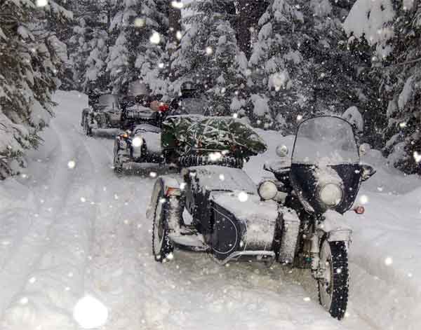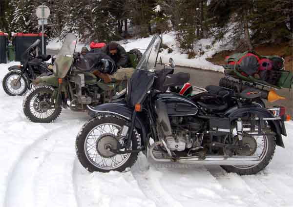 Ausgesprochen hilfreich für extremeres Winterfahren auf schlecht geräumten Wegen sind Beiwagenantriebe, z.B. der starre, zuschaltbare Antrieb der URAL-Ranger oder der permanente SW-Antrieb der DNEPR MT16 (für die MT16 gibt es übrigens auch ein sperrbares Differential - diese Kombination ist optimal). Ich selbst habe mit meiner URAL mit dem zuschaltbaren, starren Antrieb sehr gute Erfahrungen gemacht - Auffahrten zur Hütte am Gamsstein oder zur Edelraute (Tauerntreffen) werden so zum reinen Vergnügen. Man legt die Sperre oder den starren SW-Antrieb vor der ersten argen Steigung ein und kann dann bei geschlossener Schneedecke meist bis zur Hütte durchfahren. Kurven sind heikel, da muss man mit viel Gefühl den Lenker einschlagen, weg vom Gas, das Heck in die Kurve driften lassen und erst wieder Gas geben, wenn das Gespann in die gewollte Richtung schaut. Das sollte man vielleicht auf einem verschneiten Parkplatz etwas üben, bevor man sich zum Gamstein oder zur Edelrautenauffahrt wagt...