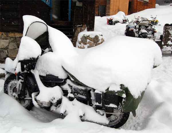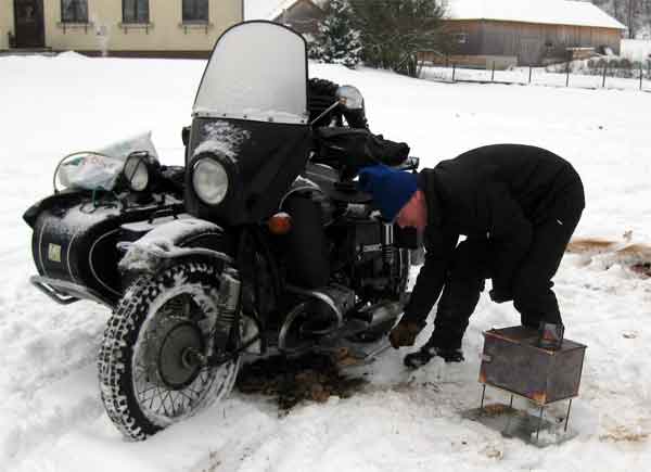 Es empfiehlt sich vor jeder Winterausfahrt sorgfältig die Einstellung von Ventilspiel, Zündung und Vergasern zu kontrollieren. Im Finstern bei heftigen Minusgraden und Schneetreiben ist das nämlich ziemlich spassfrei. Ich empfehle die Einstellung des Motors auch bei tiefen Temparaturen zu überprüfen. Schon so mancher hat sich gewundert, dass sich sein Russe nach einer Nacht mit Schneefall und heftigen Minusgraden nicht mehr ankicken lassen wollte (in der geheizten Garage ist ja doch so gut gegangen :-)). Meist kann man mit einer fetteren Gemischeinstellung am Vergaser schon kleine Wunder bewirken. Sollte der Russe trotz aller Sorgfalt aufgrund heftiger Kälte nicht anspringen wollen, hilft die Anwendung glühender Kohlen unter dem Motor (Vorsicht - keine offenen Flammen, sonst Brandgefahr). Nach einigen Minuten sind der Motorblock und die Zylinder ausreichend erwärmt um mit einem leichten Tritt am Kickstarter ihren Dienst aufzunehmen. Ich selbst breite nach einer kalten Nacht einfach die heissen Aschenreste aus dem Zeltofen unter dem Motorrad aus.